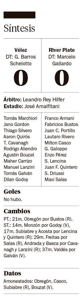 River igualó 0 a 0 ante Vélez en Liniers y dejó pasar su última chance de clasificar a la Copa Libertadores por la tabla anual. De todos modos, el conjunto de Marcelo Gallardo aún puede aspirar a jugar la mayor competencia continental si gana el actual campeonato o si el título es para Boca Juniors, Rosario Central o Argentinos Juniors, los equipos ya clasificados por la temporada.
