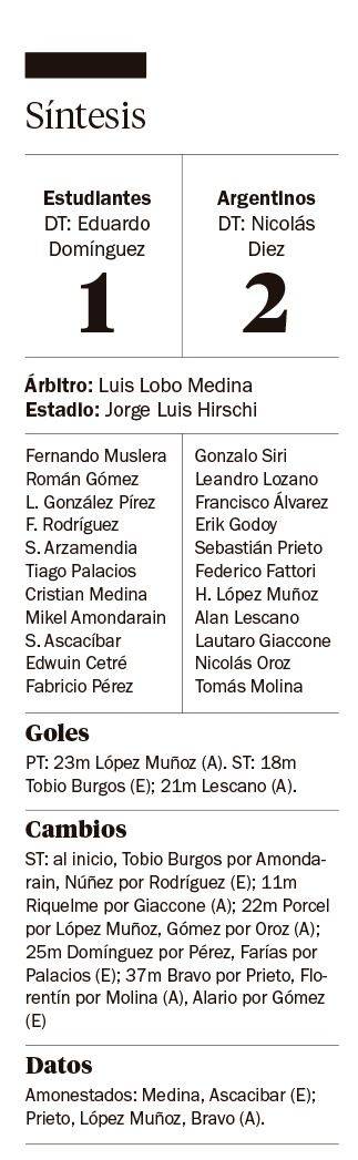 Lo que desperdició Estudiantes lo aprovechó Argentinos en el momento que sintonizó. Movió la pelota de punta a punta y desde la izquierda llegó el centro preciso para que Hernán López Muñoz, sin marca (¿y los centrales?) marcara el 1-0. Llama poderosamente la atención lo fácil que le llegan a este equipo, cuyos rivales en los primeros remares arco le hacen un gol y luego juegan con tranquilidad.