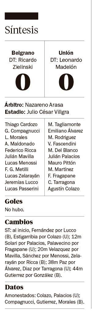 Belgrano y Unión igualaron sin goles en el estadio Julio César Villagra, en un partido cargado de tensión por la última fecha del Torneo Clausura, por lo que el equipo santafesino finalizó segundo en el Grupo A y clasificó a los playoffs, instancia en la que enfrentara a Gimnasia, el próximo fin de semana en el estadio 15 de Abril.
