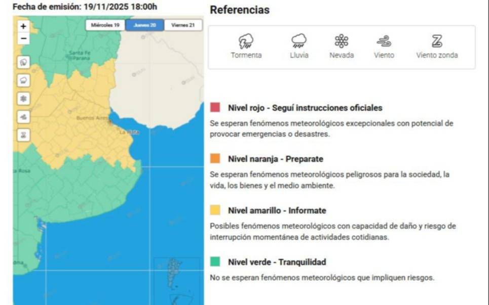 Según el Servicio Meteorológico Nacional (SMN), el alerta "Amarillo" regirá sobre La Plata y la zona norte de la Provincia de Buenos Aires desde este jueves 20 de noviembre en la tarde con tormentas aisladas y por la noche con tormentas fuertes.