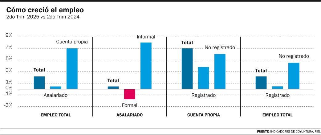 El empleo asalariado informal, en cambio, se expandió con fuerza: sumó 232 mil nuevos puestos, de los cuales 178 mil no están registrados. Esta tendencia refuerza un patrón que se repite desde hace años: el crecimiento del trabajo informal y autónomo frente al estancamiento del empleo formal.