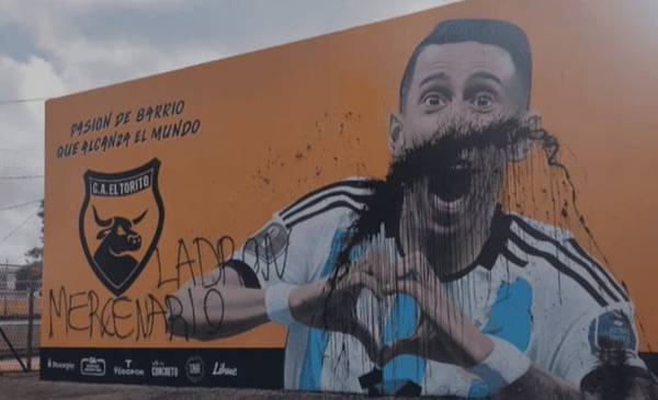 La imagen de Ángel Di María en el ingreso del club El Torito volvió a ser objeto de agresiones: en la madrugada de ayer desconocidos arrojaron pintura sobre el mural y escribieron la frase “ladrón mercenario”.