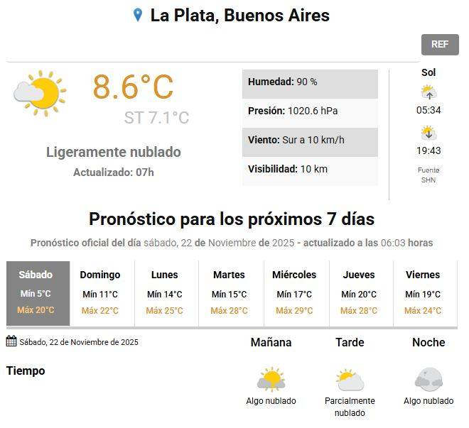 El sábado se presentaba en La Plata y alrededores con cielo algo nublado a parcialmente nublado, vientos leves y temperatura mínima de 5 grados y máxima de 20, informó el Servicio Meteorológico Nacional (SMN).