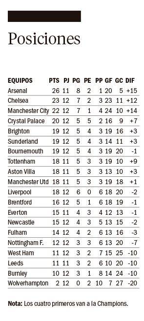En los otros cotejos de ayer, Liverpool 0, Nottingham Forest 3; Newcastle 2, Manchester City 1; Wolverhampton 0, Crystal Palace 2; Brighton 2,Brentford 1: Fulham 1, Sunderland 0 y Bournemouth 2, West Ham 2.