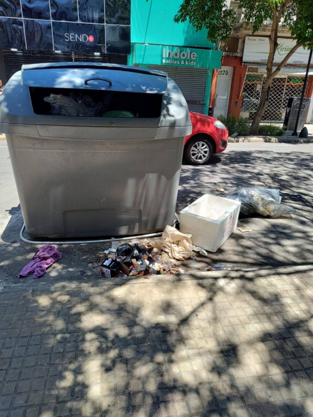 La postal de los recipientes de residuos repletos y desbordados, se convirtió en algo habitual en las calles de ese centro comercial de la Ciudad.