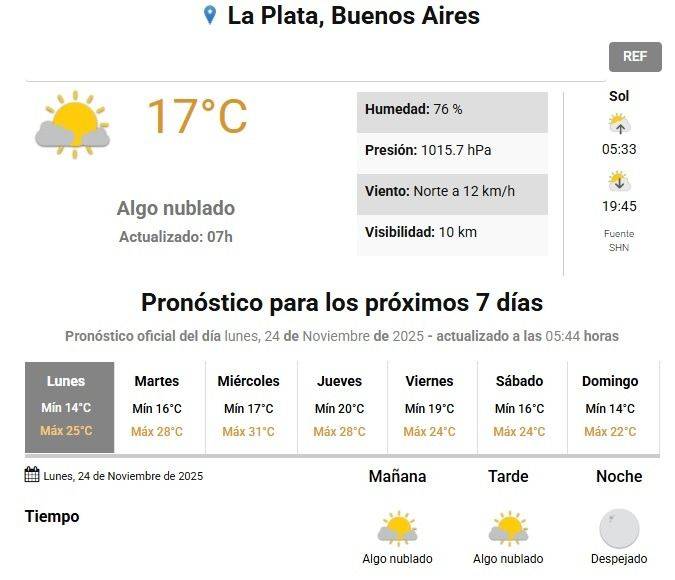 El tiempo del feriado nacional de este lunes 24 de noviembre en La Plata será para disfrutar a pleno, en el inicio de una semana en la que se espera un pico de calor. Para hoy el Servicio Meteorológico Nacional (SMN) pronostica una máxima de 25º, con cielo algo nublado durante toda la jornada y que estará despejada hacia la noche.