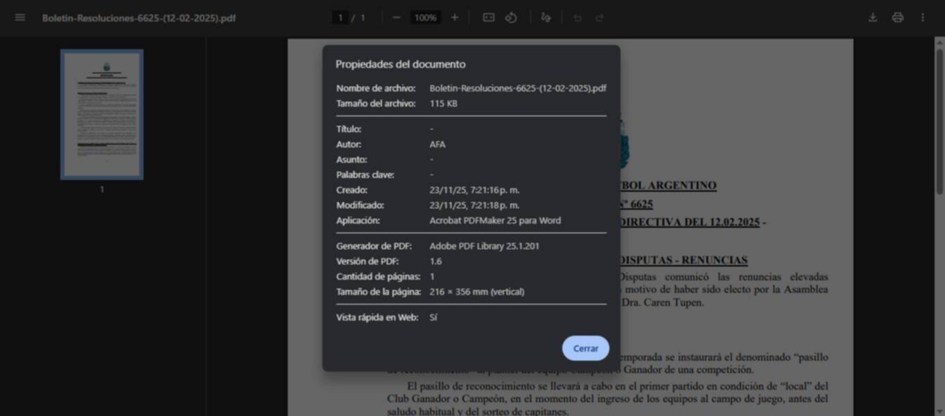 La polémica se encendió cuando se detectó que el archivo PDF del Boletín 6625 presentaba metadatos que indicaban haber sido creado el “domingo 23 de noviembre” a las 19:21, y no en febrero, como figura la fecha declarada por la AFA. Ese detalle provocó que se cuestione si la norma se redactó a posteriori —quizás para justificar una sanción— en vez de haber sido publicada con antelación al hecho que regulaba.