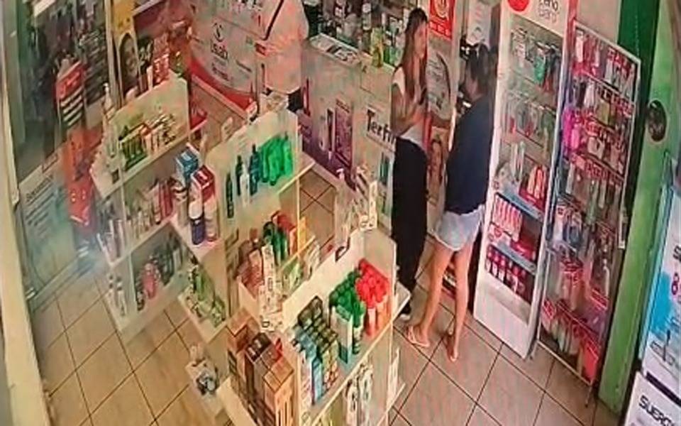 Las dos mujeres, una vestida con pantalón negro y remera blanca y la otra con short de jean y remera negra, fingen hablar entre las góndolas hasta lograr su cometido y, una vez arrasado el sector de perfumería, se retiran como si no hubiera pasado nada.