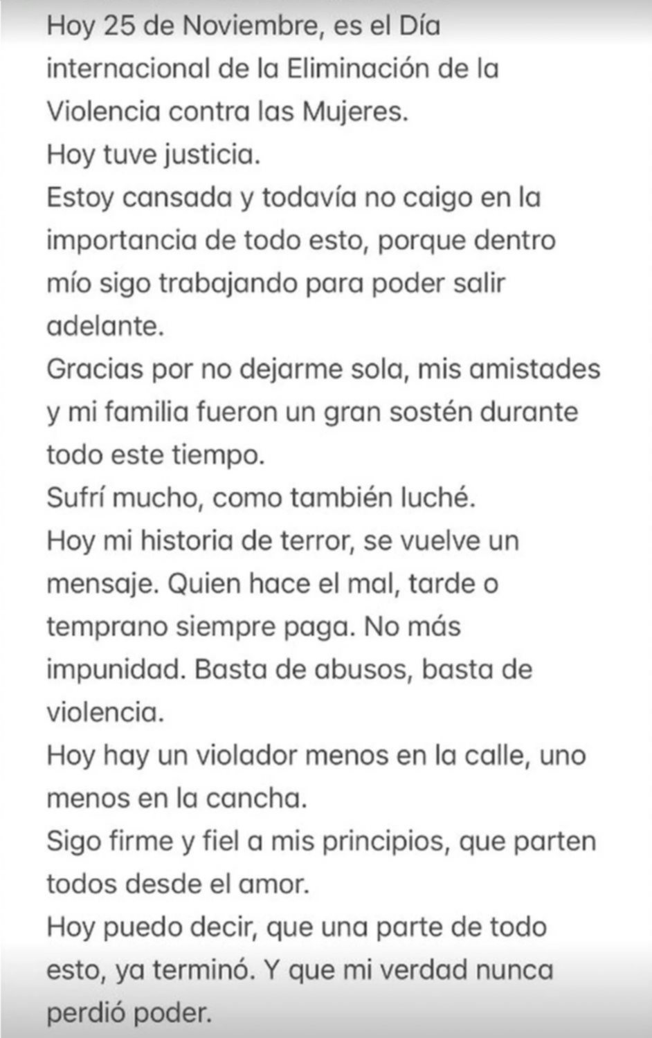 “Sufrí mucho como también luché. Hoy mi historia de terror se vuelve un mensaje. Quién hace el mal, tarde o temprano, siempre paga. No más impunidad. Basta de abusos, basta de violencia. Hoy hay un violador menos en la calle, uno menos en la cancha”, continuó.