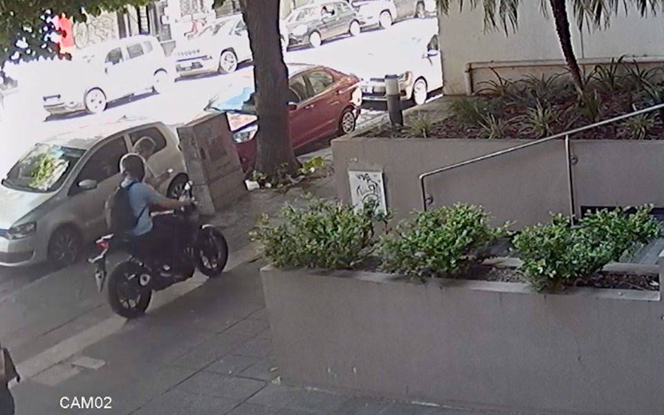 Como se aprecia en el video, un hombre estaba utilizando un celular de manera normal parado en la vereda. De repente, una moto pasó por la misma vereda, freno su marcha y en un movimiento ágil le manoteó el teléfono y escapó.