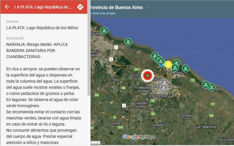 En La Plata, el alerta “Naranja” por cianobacterias fue elevado en el lago de la República de Los Niños. Por su parte, en la zona del Club Regatas de Ensenada hay alerta “Amarillo”, lo que indica niveles inferiores a los de una floración.