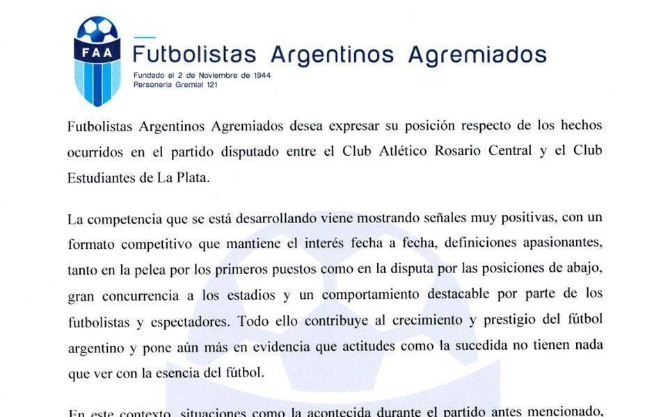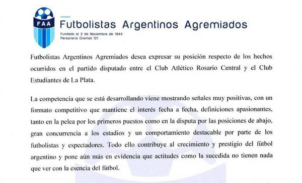 Futbolistas Argentinos Agremiados (FAA), a través de un comunicado firmado por su secretario general Sergio Marchi, fijó una postura crítica respecto del pasillo de espaldas que los jugadores de Estudiantes.