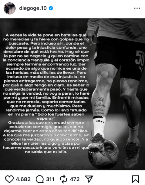 El futbolista sostuvo que fue “acusado de algo que no hice”, algo que calificó como “una de las heridas más difíciles de llevar”. A pesar del fallo en su contra, remarcó: “No pienso entregarme, no pienso rendirme, por qué si algo tengo en claro, es saber lo que verdaderamente pasó. Y hasta que no salga la verdad, no voy a parar, lo haré por mí y por mi familia”.