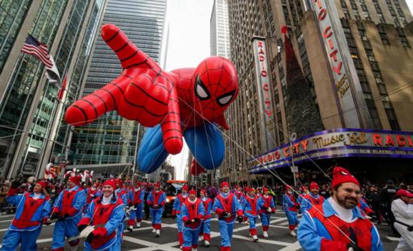 Un globo gigante del Hombre Araña en Nueva York, durante el desfile por el Día de Acción de Gracias / AP
