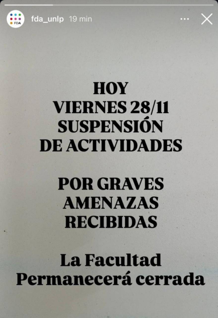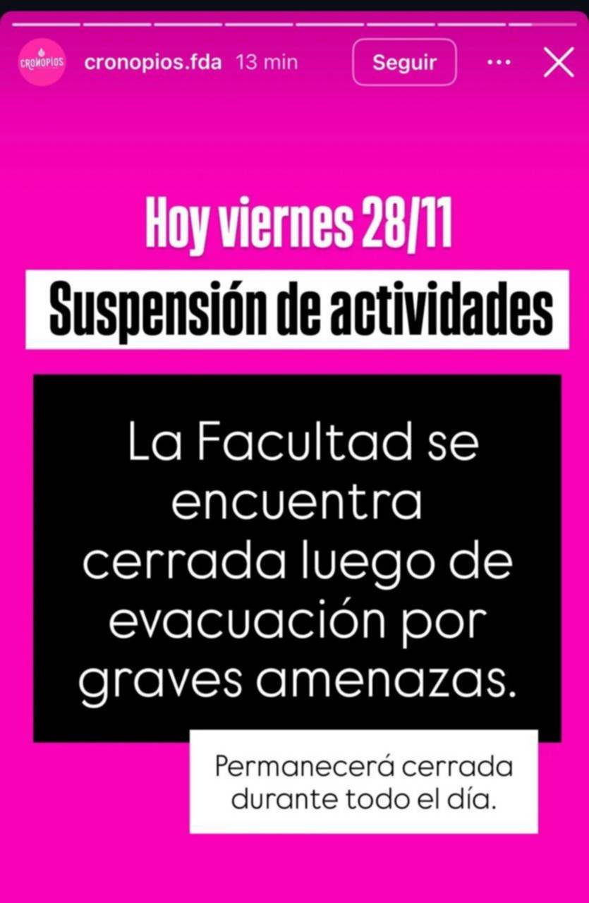 "La facultad se encuentra cerrada luego de graves amenazas", informó hoy en sus redes sociales la agrupación Cronopios, e indica que la sede "permanecerá cerrada durante toda la jornada". Mientras que la cuenta oficial de la casa de altas estudios confirmó mas tarde que este "viernes 28/11 suspensión de actividades por graves amenazas recibidas".