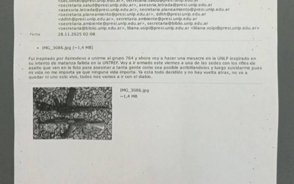 “Fui inspirado por Asmodeus a unirme al grupo 764 y ahora voy a hacer una masacre en la UNLP”, comenzó diciendo el escrito del supuesto agresor. Asimismo, según se indicaba, todo fue “inspirado en su intento de matanza fallida en la Universidad de Tres de Febrero”.