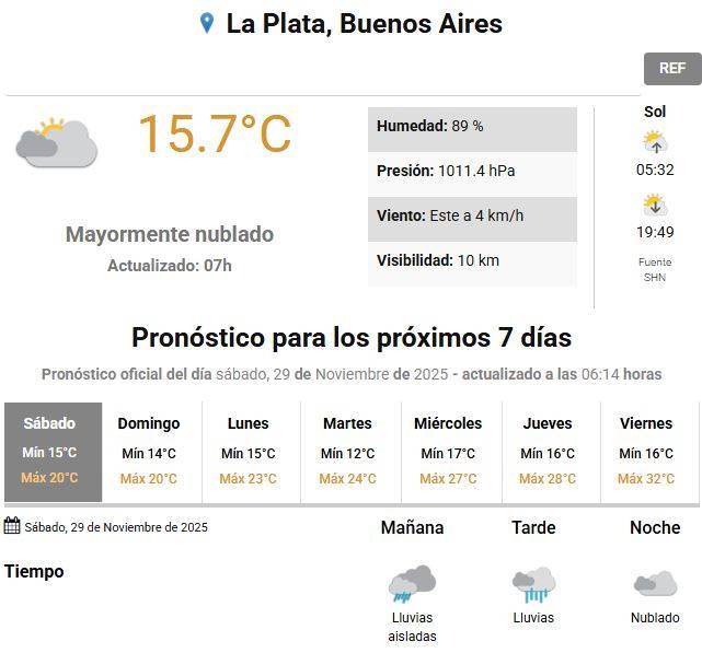 El tiempo se presentaba este sábado en La Plata y alrededores con cielo nublado y con probabilidad de lluvias durante la mañana y la tarde. Asimismo, se esperaban vientos leves y una temperatura mínima de 15 grados y máxima de 20, según informó el Servicio Meteorológico Nacional (SMN).