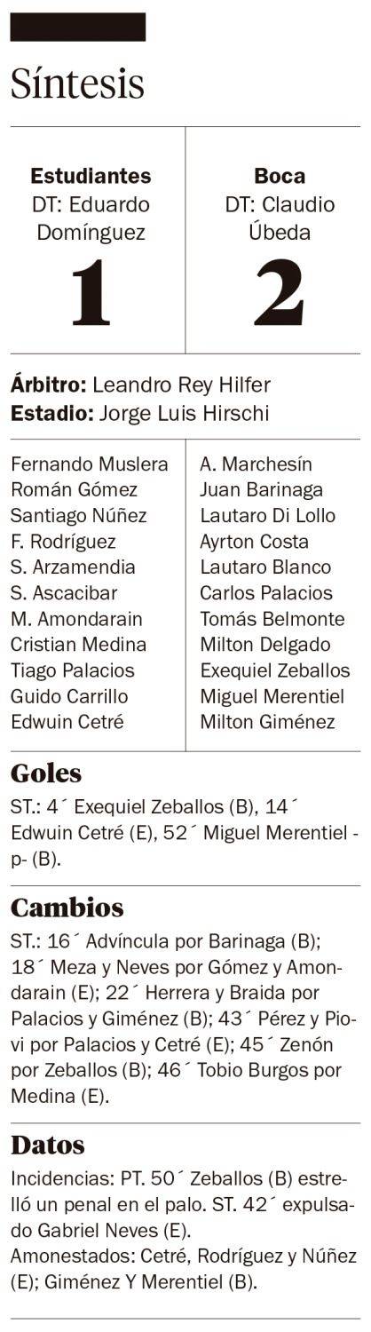En el primer tiempo Estudiantes intentó ser dominador. Al menos manejó la pelota y trató de desbordar por las puntas, principalmente en la izquierda con Edwuin Cetré y Cristian Medina. No tuvo claridad ni apretó los dientes en los metros finales pero dejó mejor sensación. El problema es que en los minutos finales otra vez evidenció las falencias que tiene cuando su defensa se adelanta unos metros y llega un pelotazo frontal. No pudo ni supo Facundo Rodríguez cómo marcar al Changuito Zeballos, el único jugar de Boca que podía complicar: penal y el mismo jugador Xeneize que lo estrelló en el palo izquierdo. Zafó el equipo albirrojo.
