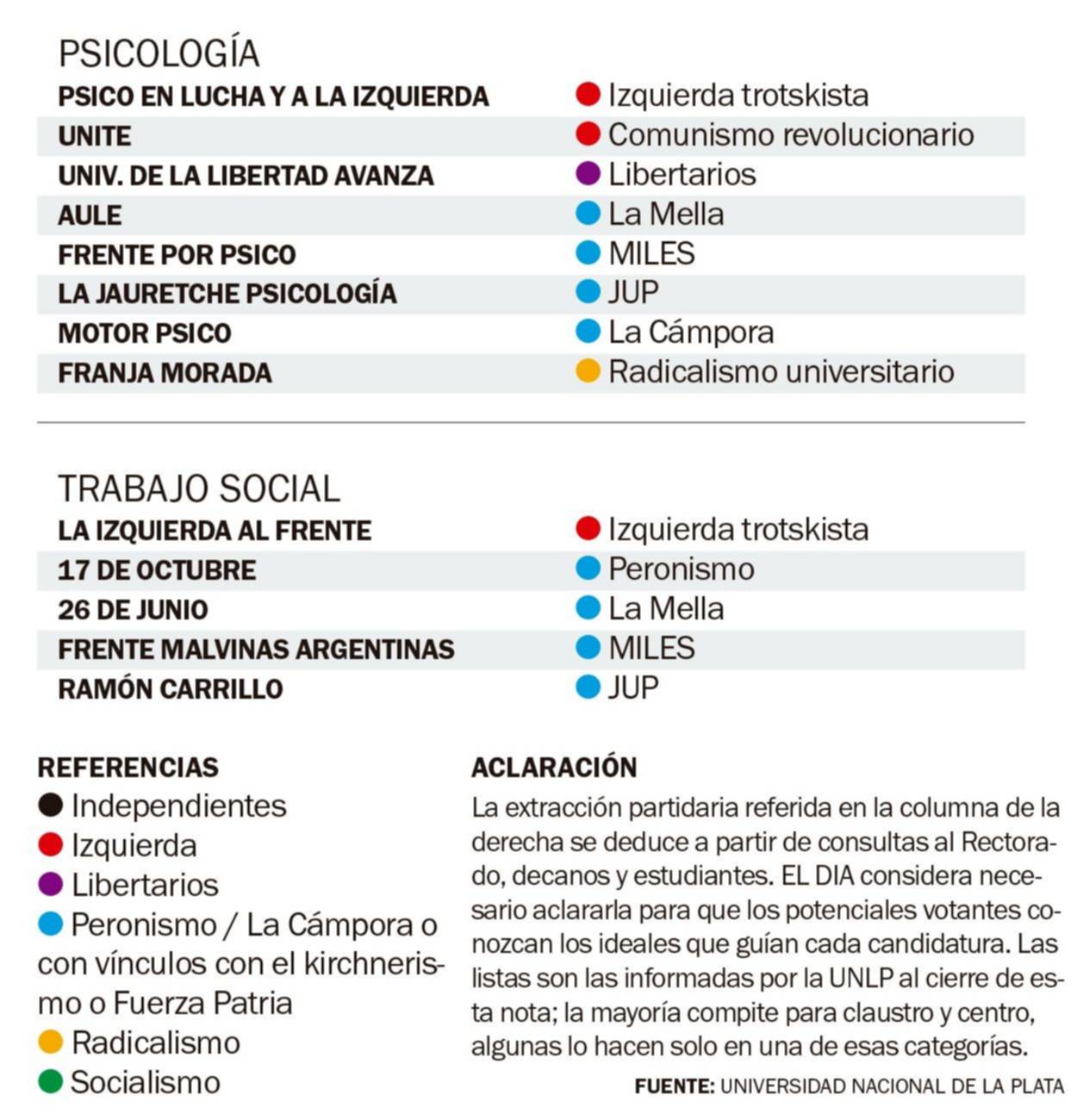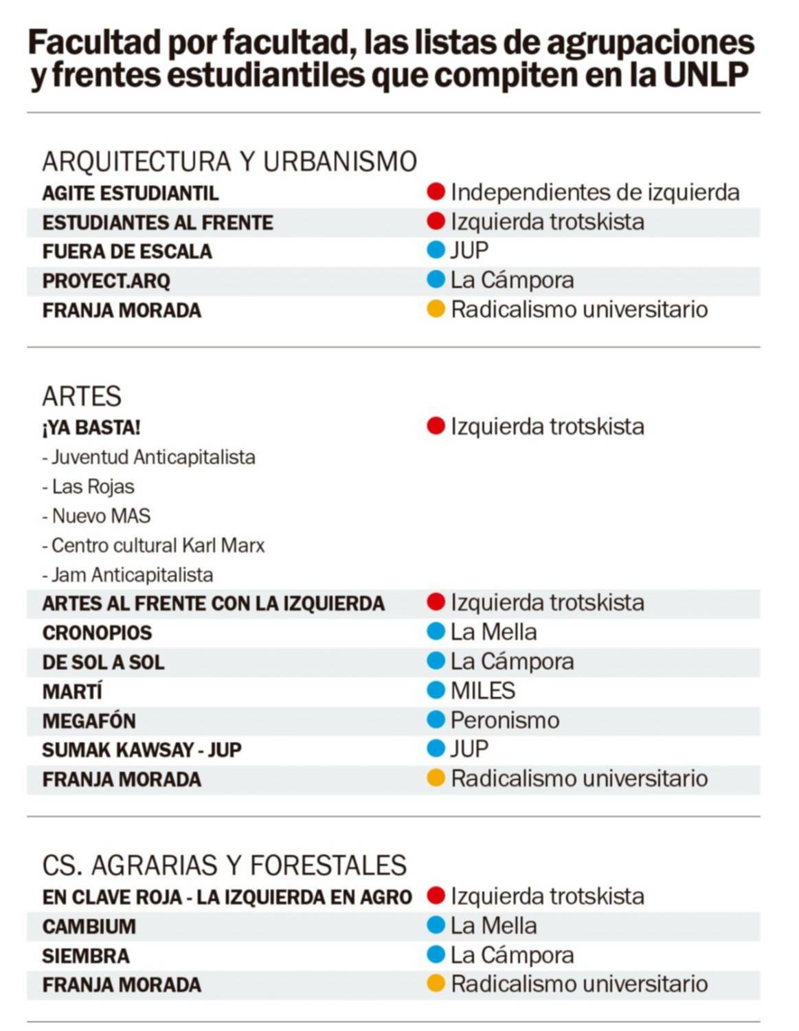 Del total de 102 listas distribuidas en toda la UNLP a las que accedió EL DIA (ver gráfico), surge que Franja Morada estará presente en 15 de las 17 facultades (no lo hará ni en Odontología ni en Trabajo Social), que la izquierda y el peronismo, atomizados y con diferentes nombres, competirán en todas las unidades académicas, mientras que los libertarios (también divididos) tendrán listas en seis casas de estudios. La oferta electoral varía de un edificio a otro: por ejemplo, mientras que en Odontología se oficializaron solo dos boletas, en Humanidades lo hicieron once.
