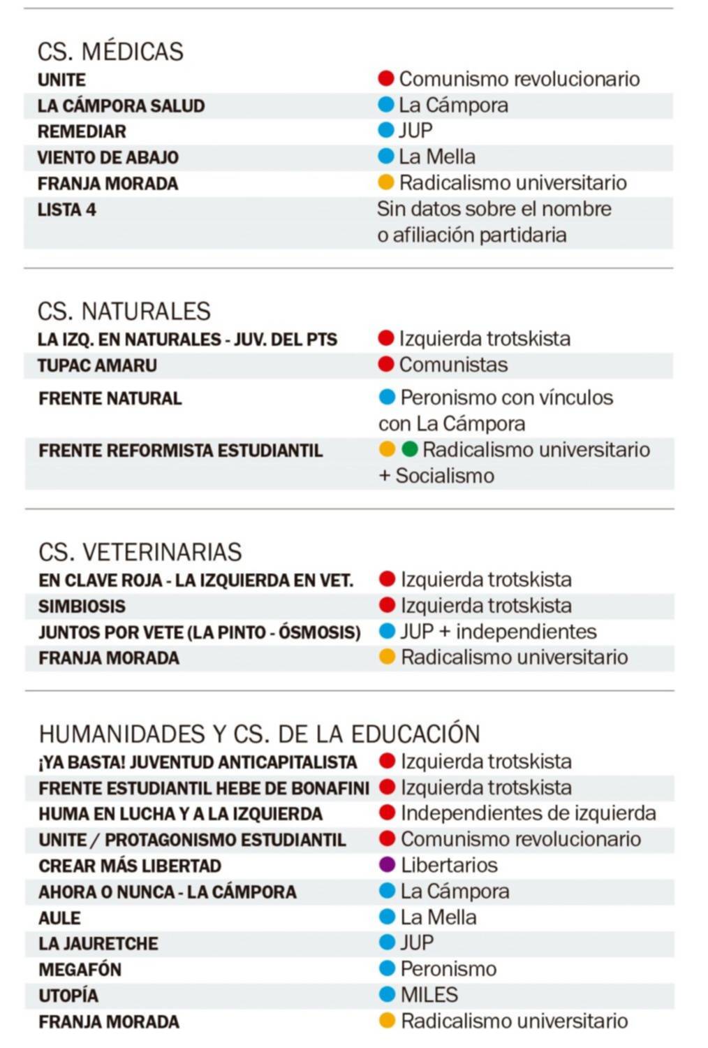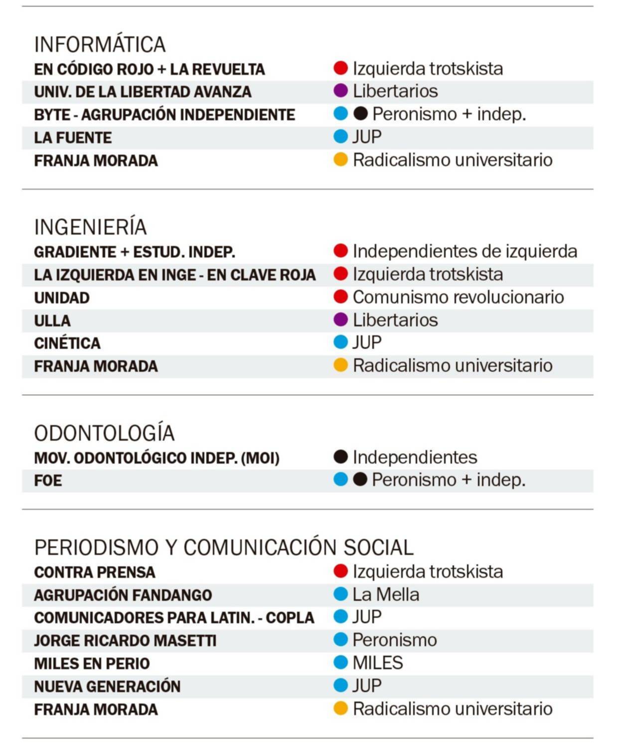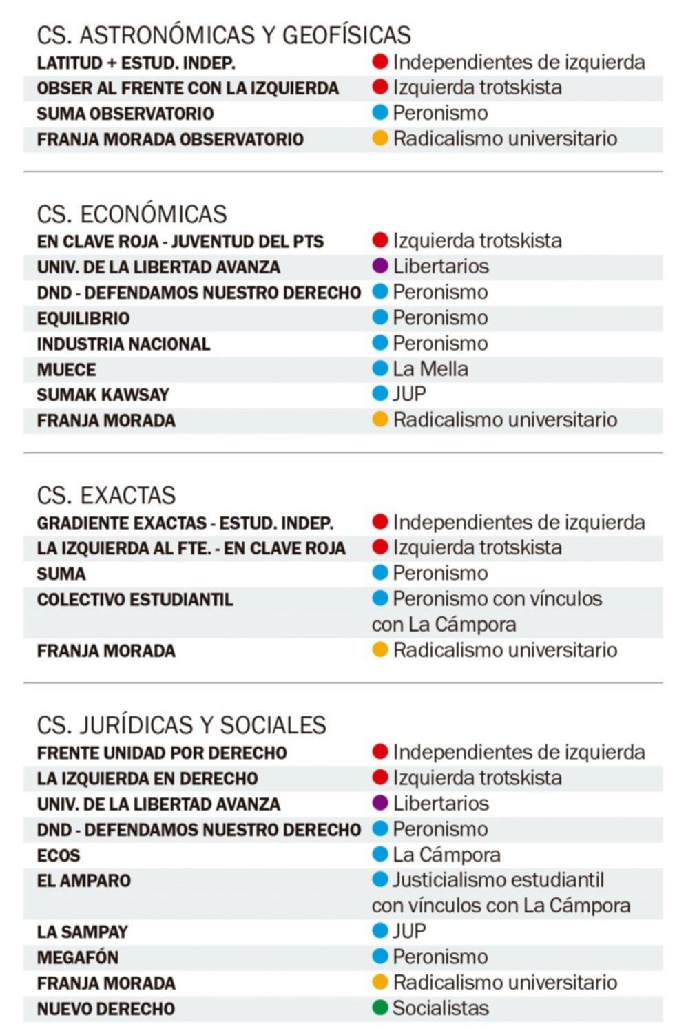 Como ocurre desde hace tiempo, el peronismo, fragmentado y ya sea a través de La Cámpora, la JUP (con referentes como el funcionario municipal Guillermo “Nano” Cara; Sancho Sanguinetti, de Conapla; Jerónimo Guerrero Iraola, dirigente de Sumak Kawsay y el exCámpora Marcel Aguilera) o con otras denominaciones, se presenta en todas las facultades, aunque solo gobierna en un puñado. Entre ellas, en las populosas Humanidades, con La Jauretche (JUP) a la cabeza, y Medicina, a través de Remediar (JUP), que la semana pasada salió a festejar el triunfo opositor en las elecciones de profesores. Un dato que podría anticipar el futuro en 60 y 120.