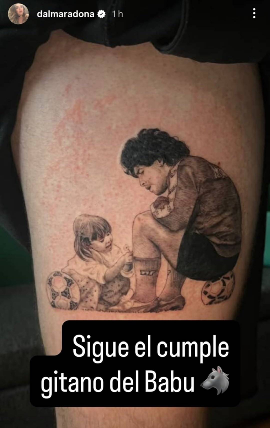 En su cuenta de Instagram, Dalma publicó una historia con una frase breve, pero llena de simbolismo: “Sigue el cumple gitano del Babu”, acompañada por un emoji de un lobo y una imagen de un tatuaje de cuando era chica, poniéndole flores en las piernas a su papá.