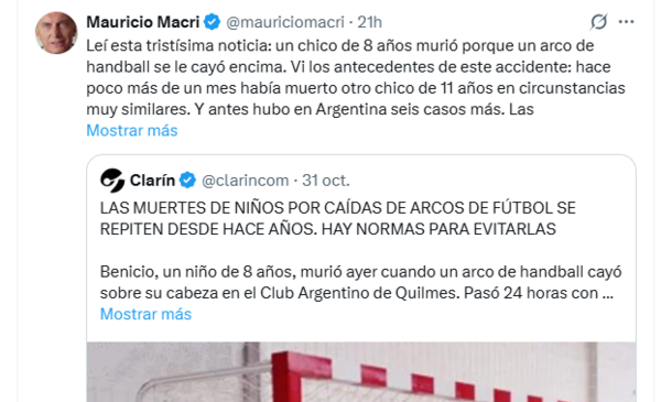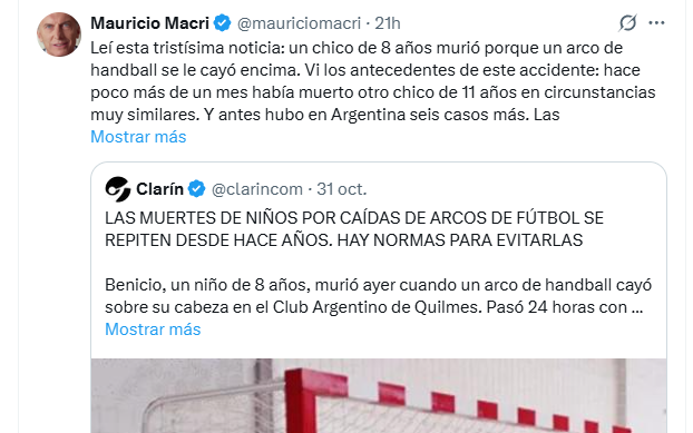 Macri citó una nota periodística sobre la repetición de muertes infantiles por caída de arcos de fútbol y escribió en la red social X (ex Twitter) su preocupación: "Leí esta tristísima noticia: un chico de 8 años murió porque un arco de handball se le cayó encima. Vi los antecedentes de este accidente: hace poco más de un mes había muerto otro chico de 11 años en circunstancias muy similares. Y antes hubo en Argentina seis casos más. Las caídas de arcos se repiten en otras partes del mundo. Esto no puede pasar más.”