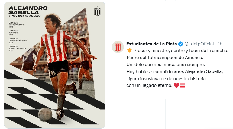 Sabella, fallecido en 2020, fue campeón con Estudiantes tanto como jugador como entrenador, dejando una huella imborrable en la historia del club y del fútbol argentino. Como DT, condujo al equipo a la Copa Libertadores 2009 y al subcampeonato del Mundial de Clubes frente al Barcelona, consolidando un ciclo inolvidable en el que combinó identidad, disciplina y sentido de pertenencia.