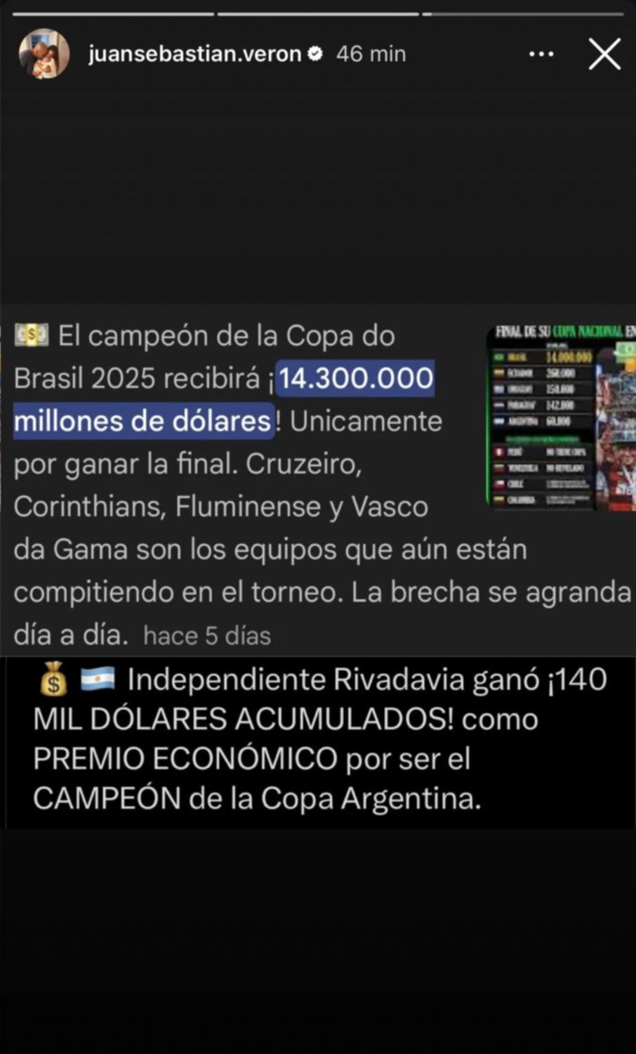 A través de una captura de pantalla donde se lee “El campeón de la Copa Do Brasil 2025 recibirá 14.300.000 millones de dólares”, la Bruja Verón escribió en una historia de Instagram: “Independiente Rivadavia ganó ¡140 mil dólares acumulados! como premio económico por ser el campeón de la Copa Argentina”.