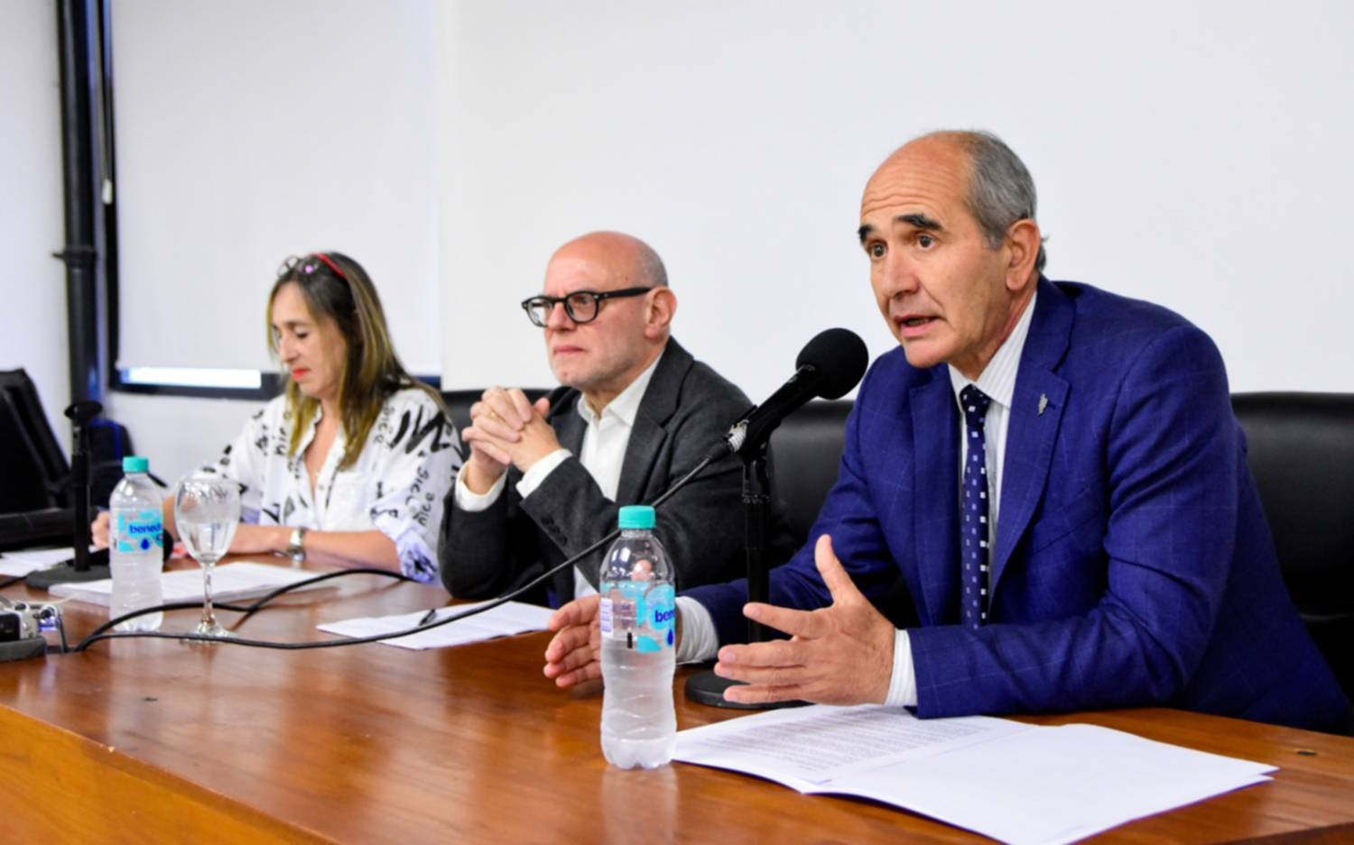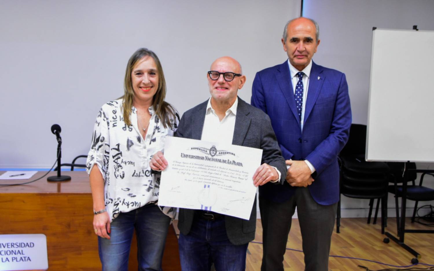 El presidente de la UNLP, Martín López Armengol, hizo entrega del galardón acompañado por la decana de la Facultad de Humanidades y Ciencias de la Educación, Ana Julia Ramírez.
