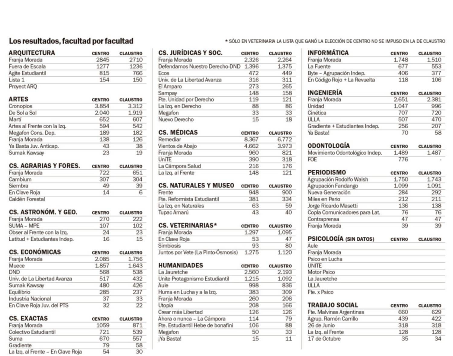 Franja Morada retenía la conducción en 9 de 17 facultades, pero perdió el claustro de Veterinarias a manos del peronismo, que se impuso en Medicina y Humanidades