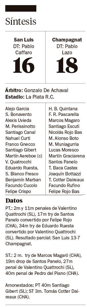 Cerca del final, Felipe Rojo desperdició un penal frente a los palos. Sin embargo, ya sobre la hora, Champagnat tuvo una última oportunidad de penal: Pedro del Piano tomó la responsabilidad y, con una patada certera, selló el 18-16 definitivo para desatar un festejo enorme, con todo el plantel abrazado en el medio de la cancha para festejar el regreso a la máxima categoría de la URBA. Y San Luis se quedó con la desazón de un descenso inesperado.