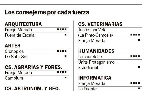 Además, como se mencionó, la JUP le arrebató la mayoría del claustro a Franja Morada en Veterinarias y, a través de Fuera de Escala, desplazó de la minoría de Arquitectura a los independientes de izquierda del Agite. En ambos casos, la vertiente que festejó fue la del dirigente Marcel Aguilera.