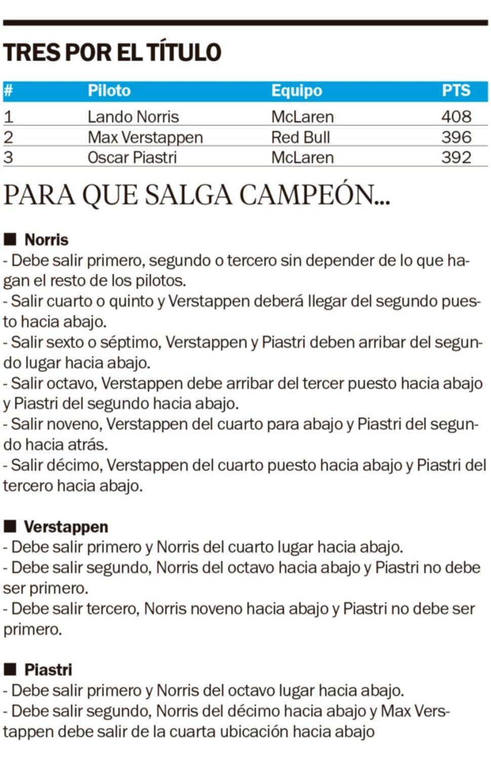 Claro que de por medio está Verstappen, que no se le puede dar un centímetro de ventaja; mientras que Oscar Piastri fue el gran “perdedor” de la fecha pese a ganar la Sprint y ocupar el segundo lugar de la carrera principal, pero la estratagema que utilizó el equipo McLaren le restó posibilidades a ambos pilotos de la escudería.