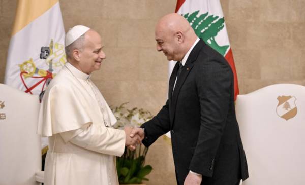 El Papa se saluda con el presidente libanés Joseph Aoun en Beirut