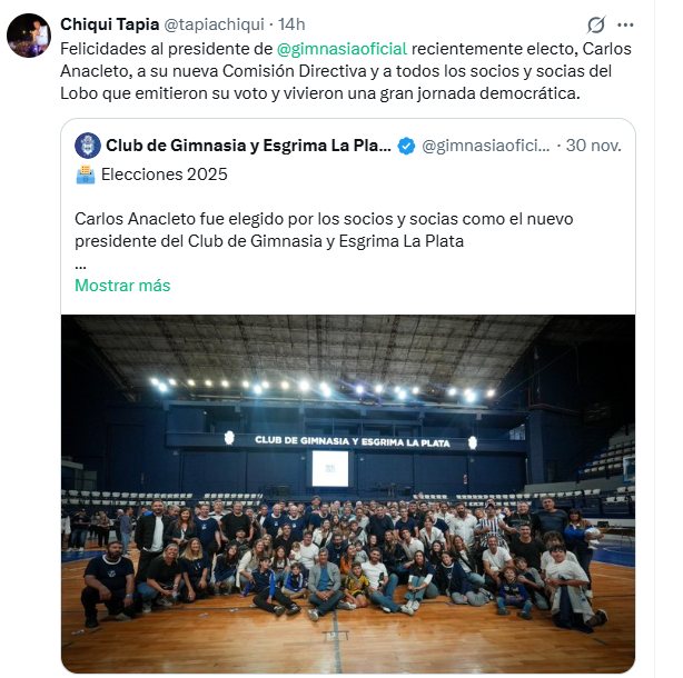 “Felicidades al presidente de Gimnasia, recientemente electo, Carlos Anacleto, a su nueva Comisión Directiva y a todos los socios y socias del Lobo que emitieron su voto y vivieron una gran jornada democrática”, escribió Tapia, en un mensaje en su cuenta oficial.