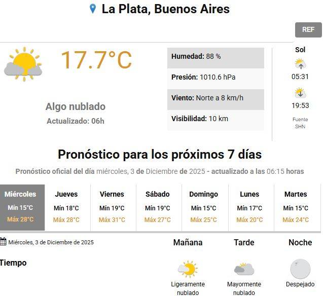 l tiempo en La Plata y alrededores se presenta este miércoles con cielo parcialmente nublado a mayormente nublado hacia la noche con probabilidad de tormentas fuertes. Se espera, además, vientos leves y aumento de las temperaturas, que se ubicarán entre 17ºC y 27ºC, según informó el Servicio Meteorológico Nacional (SMN).