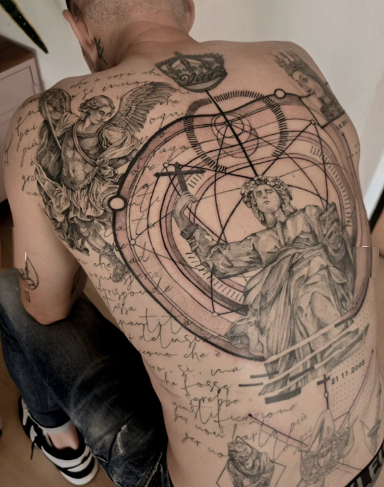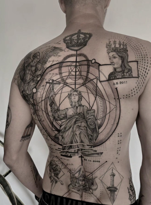 Para ella, el desafío no solo fue técnico sino también conceptual: “El tatuaje es el resultado de muchísimas cosas con un significado especial, el cual fue un gran desafío para mí porque tuve que indagar mucho y lograr una unificación de mil estilos diferentes en uno, más el significado y simbolismo de cada detalle. Tuve que integrar una corona que él ya tenía tatuada en el centro, debajo de la nuca, y lograr un estilo fino y delicado para que hubiera armonía entre todas las partes. No fue fácil, pero lo logramos y estamos felices con el resultado”.