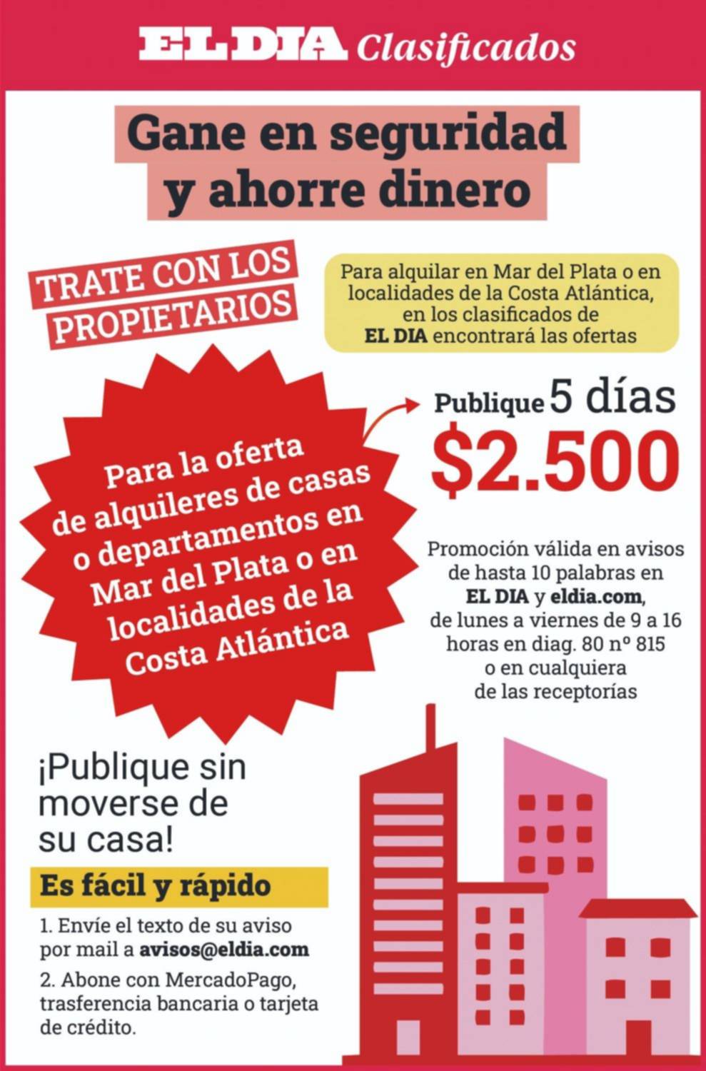 En los clasificados de EL DIA va a encontrar una gran cantidad de avisos y ofertas. Además, si busca alquilar en Mar del Plata o en cualquier destino turístico de la Costa Atlántica, gane en seguridad y ahorre dinero: trate con propietarios.