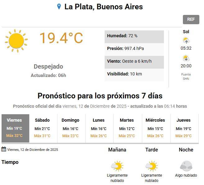 El tiempo este viernes en La Plata se presentaba con cielo ligeramente nublado, vientos leves y temperatura mínima de 19ºC y máxima de 32ºC, informó el Servicio Meteorológico Nacional (SMN).