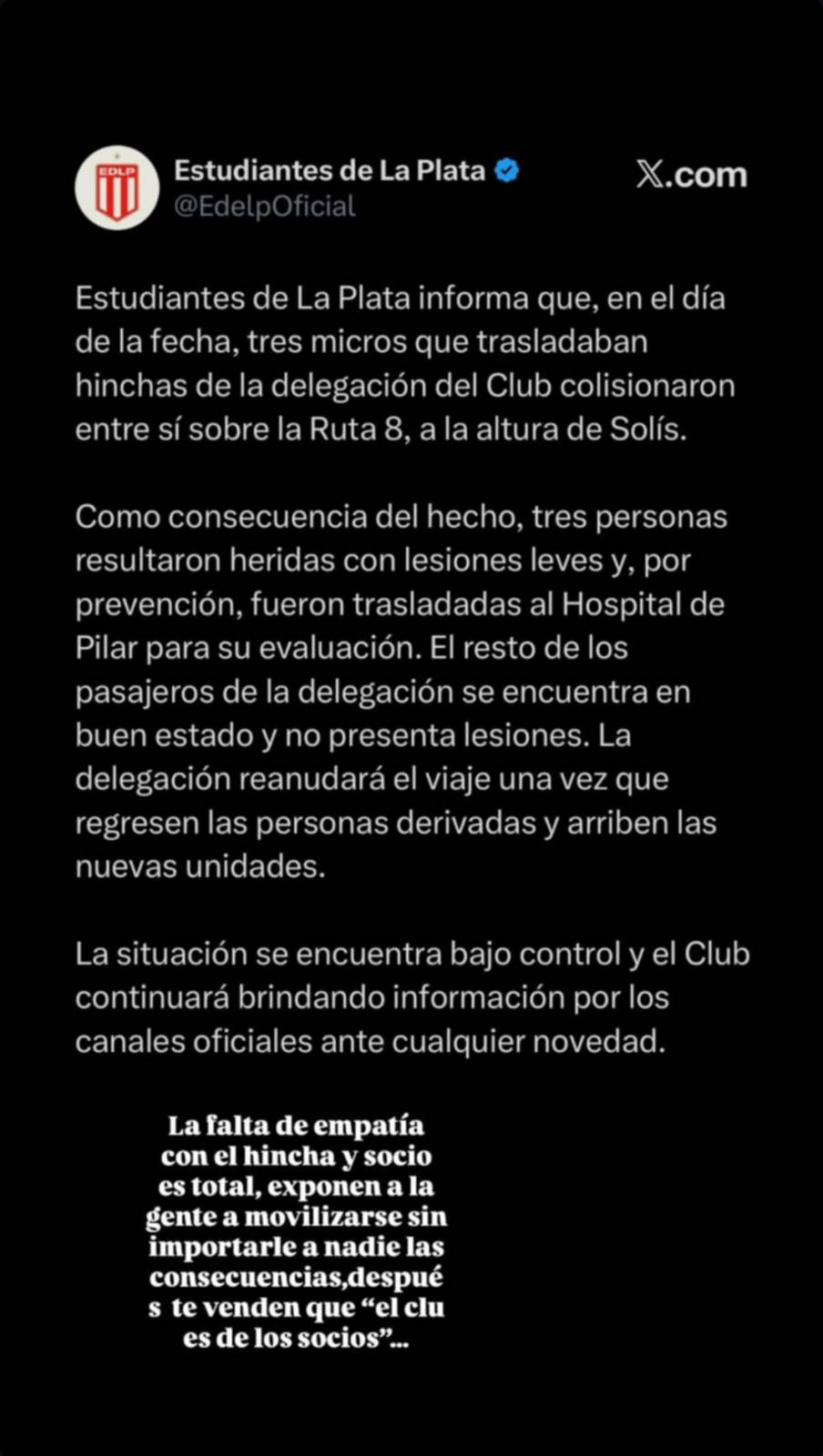 El accidente de tránsito que involucró a tres micros que trasladaban hinchas de Estudiantes a Santiago del Estero, ocurrido esta madrugada en la Ruta Nacional 8 a la altura de la localidad de Solís, generó gran preocupación en la comunidad Pincharrata. No obstante, el club emitió un rápido comunicado con información detallada que sirvió para llevar alivio a los hinchas y a sus seres queridos.