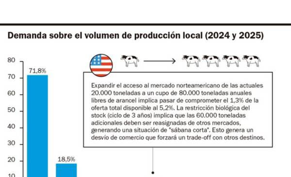 La ampliación del cupo estadounidense exportable a 80.000 toneladas, que ya se discute en el mercado, podría mejorar los ingresos totales, pero generará un reacomodamiento interno: menor oferta para consumo, presión sobre cortes de novillo y tensión con los nichos de alto valor como el kosher. La carne manufactura que demanda Estados Unidos compite con la vaca de descarte que compra China. Esa superposición obliga a elegir entre volumen o valor.