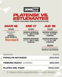 En caso de existir remanente de entradas, la Liga Profesional informará oportunamente la venta para no socios. Los precios de las entradas para Estudiantes, que este sábado irá en busca de una nueva coronación en el fútbol argentino, son los siguientes: