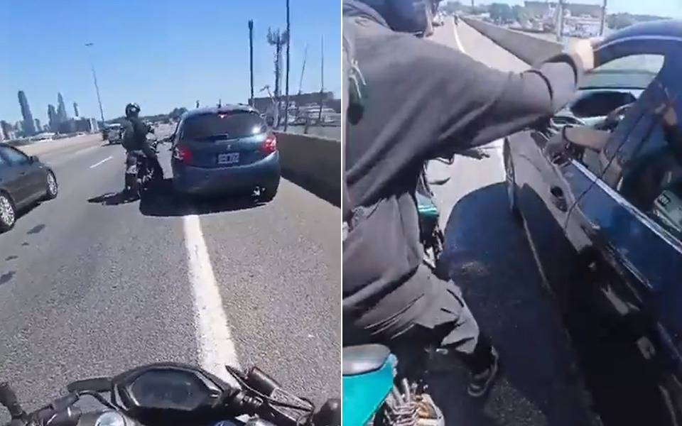 En un momento, la motocicleta logra ingresar a los carriles y se coloca del lado del conductor del auto, donde comienza una discusión que eleva el tono y se puede ver al motociclista golpear al automovilista.