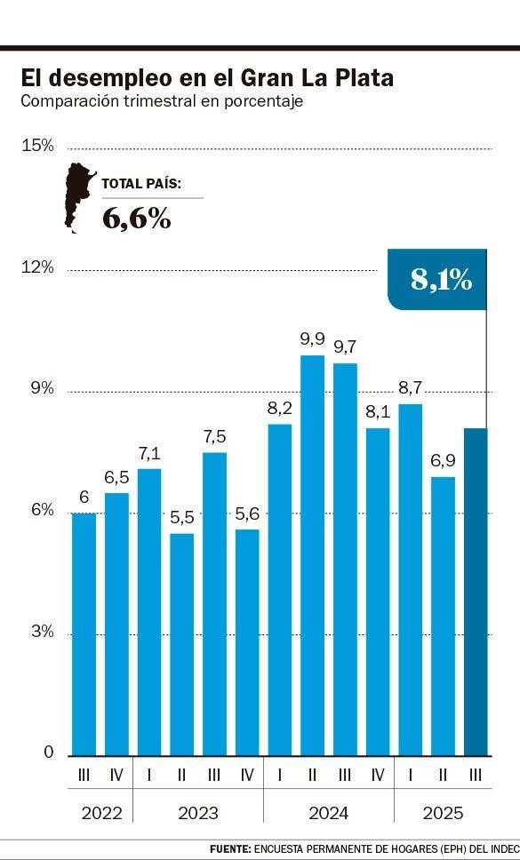 La desocupación en el Gran La Plata, que incluye a Berisso y Ensenada, es del 8,1% de acuerdo al informe del tercer trimestre del año 2025 que publicó este jueves el Instituto Nacional de Estadísticas y Censos (Indec), y supera a la media nacional (6,6%) y hasta a la del Conurbano bonaerense, que marcó 7,6%.