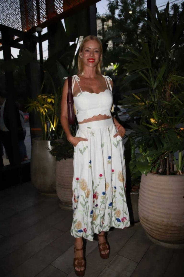 Por su parte, otra que se robó la noche fue Nicole Neumann, que se mostró con un looks fresco de top y falda larga en color blanco con detalles de florales, y finalizó el outfit sandalias color camel.
