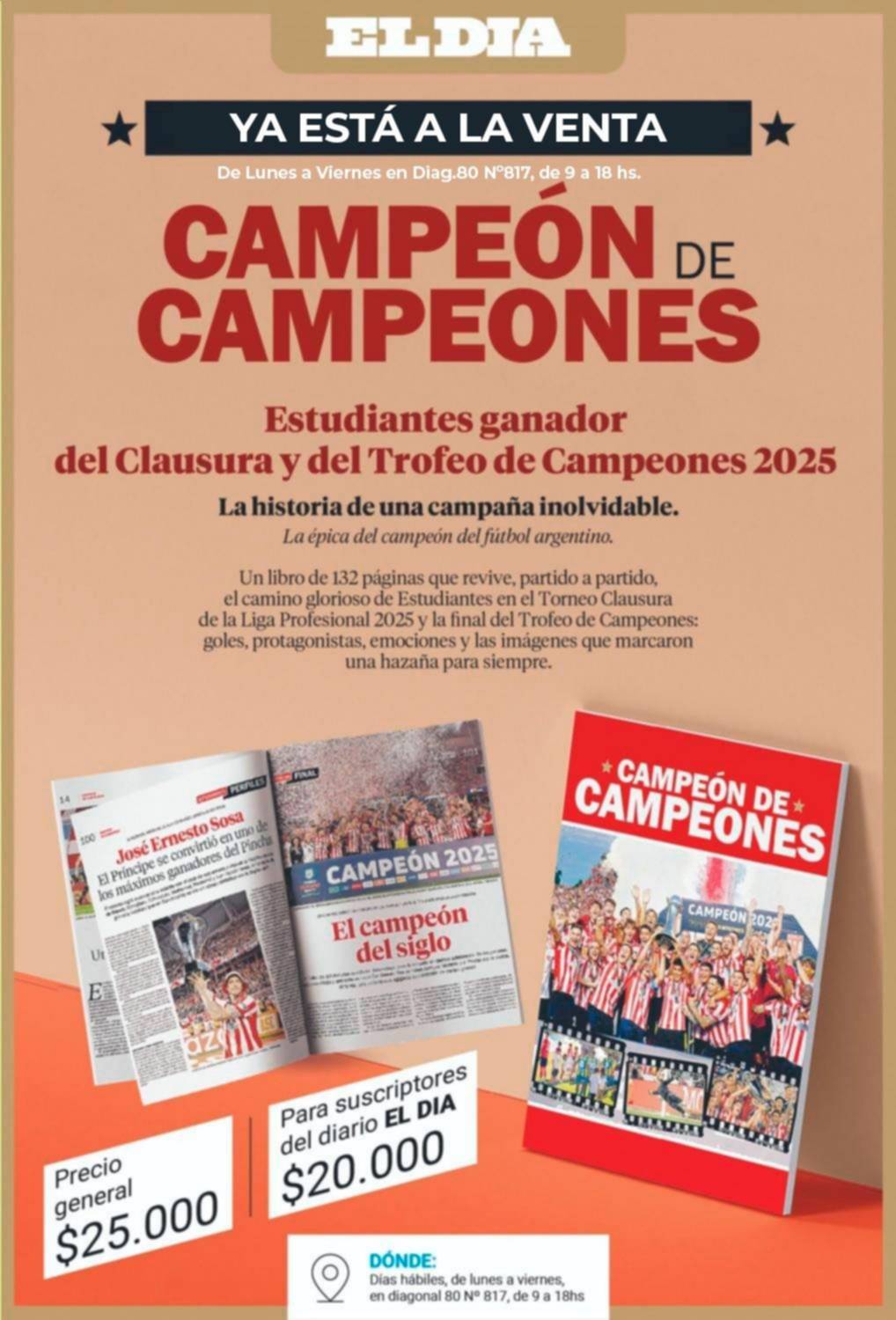 El precio de venta general es de $25.000 pero los suscriptores de EL DIA tendrán un beneficio y lo abonarán $20.000. Lo podés conseguir en la sede del diario de diagonal 80 Nº 817 (días hábiles de 9 a 18 hs), en Raiders Jeans de 47 Nº 609, en Lubricentro El Trincho y en las siguientes librerías: La Normal 7 Nº 1125, Sinsajo Libros 61 Nº 1331, City Bell Libros 13C Nº 246 entre Cantilo y 473 bis, Librería Pinocho Diagonal 3 y Cantilo.