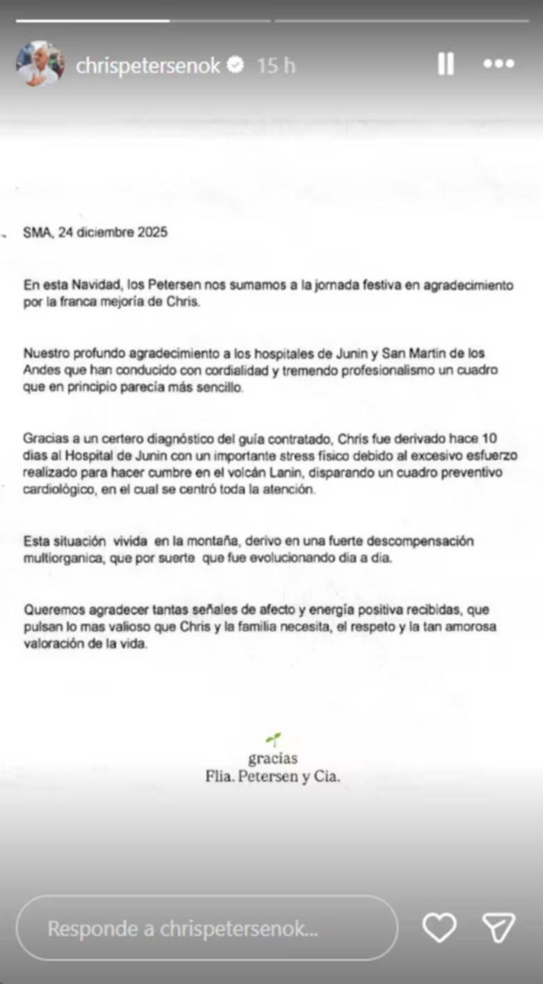 La familia del reconocido chef Christian Petersen publicó un comunicado público ayer por la noche, en medio de las celebraciones navideñas, para informar sobre la evolución de su estado de salud tras sufrir una grave descompensación durante una excursión al volcán Lanín, en la provincia de Neuquén.