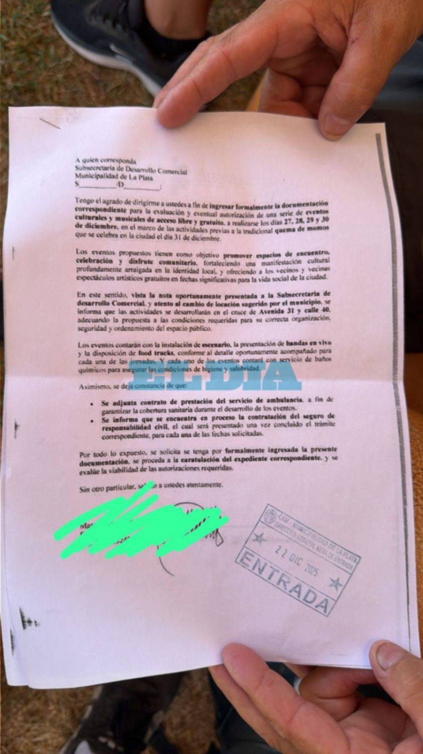 Según consta en la documentación ingresada el 22 de diciembre, con sello de recepción de la Municipalidad de La Plata, la solicitud fue dirigida a la Subsecretaría de Desarrollo Comercial y detallaba la realización de eventos culturales y musicales de acceso libre y gratuito los días 27, 28, 29 y 30 de diciembre, en el marco de las actividades previas a la quema de momos del 31.