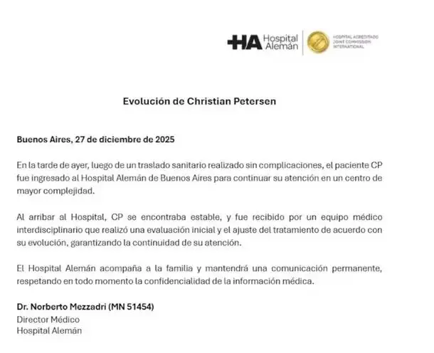 Según indicó el sanatorio, “en la tarde de ayer, luego de un traslado sanitario realizado sin complicaciones, el paciente Christian Petersen fue ingresado al Hospital Alemán de Buenos Aires”. A su arribo, el chef fue sometido a nuevos estudios y evaluaciones clínicas, y quedó bajo estricta vigilancia médica, con el tratamiento ajustado de acuerdo a su evolución.