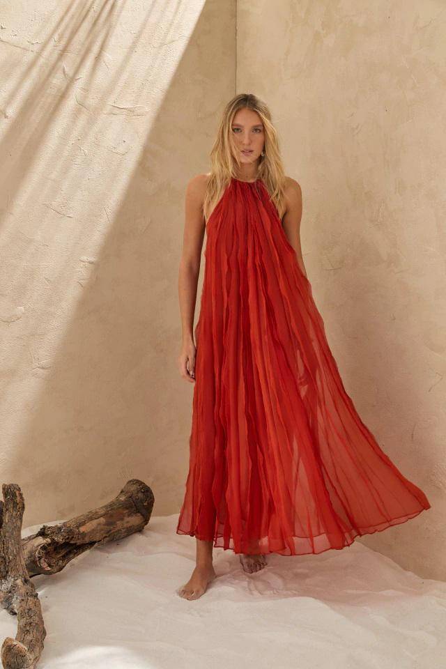 En cuanto a las prendas, Año Nuevo habilita un poco más de audacia. Vestidos con brillos, cortes asimétricos, espaldas descubiertas o telas metalizadas son bienvenidos, especialmente en celebraciones nocturnas. También se imponen los conjuntos coordinados y los enteritos, que combinan comodidad con un aire sofisticado. Las telas livianas siguen siendo clave en climas cálidos: satén, gasa, lurex suave o viscosa aportan movimiento y frescura.